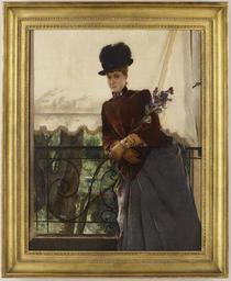 | Keywords: Alfred Stevens - Portrait of Mademoiselle Dubois - 2007.45 - Minneapolis Institute of Arts.jpg woman wearing a black hat short maroon cape long tan gloves and grey skirt holding purple flowers and leaning on a black iron rail; tan awning behind woman; trees and foliage behind railing 27 1/2 x 21 7/16 in 69 85 x 54 45 cm sight 33 1/2 x 27 7/16 in 85 09 x 69 69 cm outer frame 2007 45 https //api artsmia org/images/103327/6123/large jpg Q1700481 Oil on canvas Portrait of Mademoiselle Dubois https //collections artsmia org/index php page detail id 103327 Q20891763 |