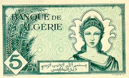| Keywords: AlgeriaP91-5Francs-1942 b.jpg es 5 francos Ron Wise's World Paper Money http //aes iupui edu/rwise Banque d'Algérie banknote Ron Wise photo 1942 Banque d'Algérie banknote Ron Wise photo photo GFDL cc-by-3 0 banknote PD-Algeria Algerian franc banknotes 1942 banknotes Banknotes with a face value of 5 Green banknotes |