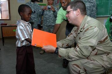 | Keywords: Ali Adde School Dedication DVIDS70089.jpg en U S Navy Capt Dennis Gallagher from Combined Joint Task Force-Horn of Africa presents a gift to a local student at a school dedication ceremony in Ali Adde Dedication ceremonies are held when certain civic construction projects in coordination with CJTF-HOA and local government officials have been completed CJTF-HOA conducts unified action in the Combined Joint Operations Area-Horn of Africa to prevent conflict promote regional stability and protect coalition interests in order to prevail against extremism 2007-12-15 https //www dvidshub net/image/70089 071215-N-+++++-101 2007-12-22 14 26 DJIBOUTI DJ PD-USGov-Military-Navy Combined Joint Task Force - Horn of Africa Images from DoD uploaded by Fæ |