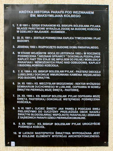 Keywords: Alians PL LublinChurchMaximilianKolbe,2009 08 11,P8110020.jpg en Built plaque commemorating the history of the creation of the church of St Maximilian Kolbe in Lublin pl Wmurowana tablica upamiętniająca historię powstania kościoła pod wezwaniem św Maksymiliana Kolbego w Lublinie own Alians PL 2009-08-11 Maximilian Kolbe Church in Lublin