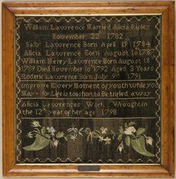 | Keywords: Alicia Lawrence - Family register sampler - Google Art Project.jpg 1787 1866 Alicia 6842449 Lawrence 1787 - 1866 /collection/cooper-hewitt-national-design-museum/artwork/family-register-sampler-alicia-lawrence/6861004/ 239830 Alicia Lawrence /artist/alicia-adams-ripley-lawrence/29120178/ 29120178 /collection/cooper-hewitt-national-design-museum/ Cooper-Hewitt National Design Museum 3644669 http //www cooperhewitt org/ /collection/cooper-hewitt-national-design-museum/artwork/family-register-sampler-alicia-lawrence/6861004/ 1798 1798 Medium silk embroidery on linen foundationTechnique embroidered in cross stitch on plain weave foundation Ex coll Fraser-Martin Purchased at Mercur sale 6861004 False 1798 2008-31-14-a b http //collection cooperhewitt org/view/objects/asitem/id/239830 Gift of Myra M and William H Mathers Family register sampler 1790 1800 1798 False 0 978515625 Object family-register-sampler-alicia-lawrence Family register sampler f Frame H x W 47 6 x 48 9 cm 18 3/4 x 19 1/4 in New York NY Colonial Dames building 215 East 71st Street Opening exhibition November 5 1930 to February 1 1931 Alicia Lawrence's Work Wrought in the 12th year of her age 1798 Medium silk embroidery on linen foundationTechnique embroidered in cross stitch on plain weave foundation Ex coll Fraser-Martin Purchased at Mercur sale special url_id KwGvs1ge6OYaBQ PD-old-100-1923 1866 Google Art Project works by Alicia Lawrence Textiles in the Cooper “Hewitt Smithsonian Design Museum 1790s samplers Google Art Project works in Cooper-Hewitt Smithsonian Design Museum Family registers 1798 works |