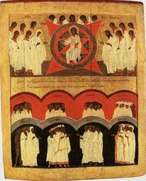 | Keywords: All saints (Rostov, 16 c., Rostov Kremlin).jpg еделя всех святых Век XVI есто создания Россия есто х анения Поступила в музей в 1921 году из соб ания А А Титова Рестав ация Рестав и ована в 1986 году в ВХ РЦ Я цевой Л К Разме 89 х 72 ате иал Де ево темпе а Иконог афическая сп авка Композиция иконы азделена по го изонтали на две части Вве ху в цент е изоб ажен Х истос Эммануил во славе между п едстоящими в молении Богомате ью и Иоанном п едтечей Он ок ужен сонмом ангельских сил с еди кото ых выделены лики ангелов и а хангелов В нижней части иконы в два яда изоб ажены г уппы святых об амленных к асными и зеленовато-се ыми волнооб азными полосами напоминающими соединенные между собой а ки Каждая из г упп п едставляет собой оп еделенный лик святости названный в надписи Вве ху - п аотцы святители мученики и п еподобные жены; внизу - п еподобные п о оки апостолы и мученики Данная иконог афия заимствована из композиций Шестоднева где каждый из дней недели согласно богослужебной т адиции соотносился с п ославлением оп еделенных событий и чинов святости http //lib pstgu ru/icons/index2 php option com_content view article id 1834789237 1834789237 catid 8 2009-11-26-12-54-34 Itemid 10 pageres 1 century 16 Creator Unknown Icons of All Saints Files uploaded by Shakko from various sources Icons of Rostov Icons in Rostov Museum-Preserve PD-Art |