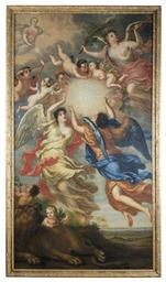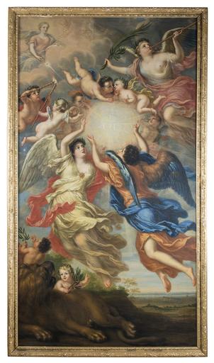 | Keywords: Allegori över konung Karl XIs och drottning Ulrika Eleonoras förmälning (David Klöcker Ehrenstrahl) - Nationalmuseum - 174869.tif Kung Karl XI Drottning Ulrika Eleonora d ä information field Kring en strålgloria utgående från Karl XI s och Ulrika Eleonoras i ett starkt sken ställda krönta monogram gruppera sig olika figurer Längst upp till vänster sitter Providentia divina Guds försyn på ett moln iklädd ljust röd klänning och ljust blå mantel Hon riktar en solstråle mot monotrammet Upptill till höger svävar de goda ryktet iklädd fladdrande ljust blå klänning och ljust röd mantel Hon håller en olivkvist i ena handen och i den andra en basun i vilken hon blåser Under monogrfammet synes Virtus dygden och en skyddsängel höja sig i luften mot detta för att tillsammans med någrfa amoriner sammanfläta monogrammen Virtus är iklädd gulgrön klänning och röd fladdrande mantel Två av amorinerna hålla facklor i händerna medan två smeka varandra Nedtill till höger två länder skilda av ett sund På den ena sidan av detta synes Hälsingborg på den andra Kronborg Längst till vänster ligger det nordiska lejonet omgivet av två Fredens barn med olivkvistar header Kring en strålgloria utgående från Karl XI s och Ulrika Eleonoras i ett starkt sken ställda krönta monogram gruppera sig olika figurer Längst upp till vänster sitter Providentia divina Guds försyn på ett moln iklädd ljust röd klänning och ljust blå mantel Hon riktar en solstråle mot monotrammet Upptill till höger svävar de goda ryktet iklädd fladdrande ljust blå klänning och ljust röd mantel Hon håller en olivkvist i ena handen och i den andra en basun i vilken hon blåser Under monogrfammet synes Virtus dygden och en skyddsängel höja sig i luften mot detta för att tillsammans med någrfa amoriner sammanfläta monogrammen Virtus är iklädd gulgrön klänning och röd fladdrande mantel Två av amorinerna hålla facklor i händerna medan två smeka varandra Nedtill till höger två länder skilda av ett sund På den ena sidan av detta synes Hälsingborg på den andra Kronborg Längst till vänster ligger det nordiska lejonet omgivet av två Fredens barn med olivkvistar 1692 Oil on canvas Olja på duk Size cm 189 dager357 Institution Nationalmuseum Stockholm Drottningholms slott Signerad D K Ehrenstrahl f A o 1692 accession number 174869 NMDrh 127 place of creation Q34 Linn Ahlgren / Nationalmuseum Nationalmuseum Stockholm cooperation project Licensed-PD-Art PD-old-auto PD-Nationalmuseum_Stockholm 1698 Media contributed by Nationalmuseum Stockholm 2016-10 Media contributed by Nationalmuseum Stockholm connect to wikidata item Paintings in the Nationalmuseum Stockholm Paintings at Royal Domain of Drottningholm Charles XI of Sweden Ulrica Eleanor Swedish queen 1680 David Klöcker Ehrenstrahl |