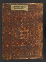 | Keywords: Allegoriae super tabernaculum Moysi and Allegoriae super Leviticum - Lower Cover (Add ms 82947).jpg Style Unspecified; Caption Lower Cover; Colour Unspecified; Edge Unspecified exhibition history Decorative Technique Unspecified; Cover Material Unspecified Original 12th-century binding of panelled red-brown leather over bevelled wooden boards tooled in blind within a ruled framework the front cover with an outer border formed by the repeated use of two tools with birds and an inner border of two foliate tools central compartment with four registers with the double impression of a stag top and bottom St Peter and flower heads at all interstices; the back cover with outer border with the repeated use of tools with Luke's winged ox and a bird beneath an angle an inner border with a two-headed grotesque and a prancing deer central compartment with two vertical tendrils flower heads at interstices remnant of one strap small losses of leather at upper front joint and top edge of front cover and from centre of back cover outer corners very slightly worn six tiny wormholes in front cover and one in back lacking two clasps and pins and upper spine tab Parchment label on back cover with the title De mistica exposicone sacrificiorum' in black ink and paper pressmark label '413' at the head of the spine object history Text 12c; Austria; Unspecified object type Cc-zero place of creation Binding France place of discovery Unspecified British Library image http //www bl uk/catalogues/bookbindings/LargeImage aspx RecordId 020-000018517 ImageId ImageId 57143 Copyright BL Allegoriae super tabernaculum Moysi and Allegoriae super Leviticum Uploaded with GWToolset Allegoriae super tabernaculum Moysi and Allegoriae super Leviticum - Lower Cover Add ms 82947 http //www webarchive org uk/bldatasets/bindings/add_ms_82947_fbrigv jpg 12th-century bookbinding British Library Additional Manuscripts British Library Bookbindings Taken with Phase One P45+ |