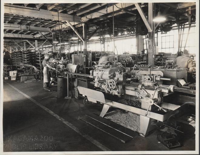 | Keywords: kalamazoo public library michigan history photography allen electric company machine shop material workmen machines factory manufacturing Interior of Allen Electric Company, the machine shop. The original photo caption reads, "Allen Electric Company. Machine Shop, where material is cut." Several men working at machines. KPL catalogue number P-113. Interior of Allen Electric Company, the machine shop. The original photo caption reads, "Allen Electric Company. Machine Shop, where material is cut." Several men working at machines. KPL catalogue number P-113. |
