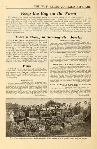 | Keywords: Allen's book of berries (16204022579).jpg 4 <br> THE W F ALLEN CO SALISBURY MD <br> Keep the Boy on the Farm <br> We believe every farmer or fruit-grower would like to keep his boy on the farm would like for him <br> to go ahead and make an even greater success than his father The first step in this direction is to get him <br> interested make the work as agreeable to him as possible'and make it show a good return to him You <br> can't do better than to let him have ground for a berry patch all his own He will be interested right off <br> he will like the work and take a pride in it; and he will be especially happy in marketing the fruit Working <br> in beautiful fruit is always a pleasure and it will be more so to your boy when he begins to realize a big <br> profit on his berries either on a local market or from shipments to the city Let him start a patch Our <br> collection D page 6 is just what he needs to make a successful start Help him get started and he won't <br> want to leave the farm <br> There is Money in Growing Strawberries <br> QUICK RETURNS One of the things that makes <br> Strawberry-growing so attractive is the quick <br> returns that are realized In growing any other <br> kind of fruit ” blackberries raspberries peaches <br> apples etc ” two three four or even six years are <br> required before fruit is produced and even then not <br> a full crop Strawberries are different The plants <br> are set in spring; they grow just one year and then <br> produce a full crop of fancy fruit <br> TWO CROPS More than that the beds can be <br> renewed just after the crop is off see page n and <br> another crop can be produced the next year ” j'ust <br> as good as the first and with very little expense <br> Profits <br> How much we can expect depends on the land and <br> the market Given good care on good land berries <br> will produce from 3 000 to 15 000 quarts per acre <br> and with even a fair market this will pay the grower <br> handsomely Here are a few reports from some of <br> our customers <br> 2 000 AN ACRE <br> February II iyi6 Clay County Ind <br> Dear Sirs I received your 1916 Book of Berries this spring <br> as usual; having received it regularly for the past is or 16 years <br> so long that I would be greatly disappointed not to find it <br> among my mail at the appointed time I have raised berries <br> from plants received from you of the Senator Dunlap variety <br> that made me nearly 2 000 per acre I know that this sounds <br> like a fairy tale but it is true The ground was accurately <br> measured and an accurate account kept Of course this was <br> an exception but they have always paid Cordially yours <br> J as L Tucker <br> 15 000 QUARTS PER ACRE <br> February 8 1916 Sullivan County Ind <br> Dear Sirs Find under separate cover a picture of one of <br> my Strawberry fields see page 1 which yielded 15 000 quarts to <br> the acre They were Fendall pollenized by Aroma bought <br> from you Mr Allen I am going to order from you again this <br> spring I have bought Strawberry plants of you for ten years <br> from 2 000 to 6 000 every year Can say without fear or favor <br> the plants always come on time in good shape good count and <br> best of all true to name Yours truly John R Snyder <br> A GOOD CROP <br> February 29 1916 Page County Va <br> Dear Sirs The plants ordered from you were the finest I <br> ever saw Set the 1 200 in 1914 March 20 and gathered 1 280 <br> quarts the following spring There are no better plants than <br> Allen's Sincerely W O May <br> FANCY PRICES FOR PROGRESSIVE BERRIES <br> January- 15 1916 Montgomery County Ohio <br> Kind Sirs I received your catalog; it is grand From the <br> Progressives shipped me last year I furnished berries to the <br> Algonquin Hotel Hollencamp's Brewery and many private <br> customers The Dayton Herald and Journal gave me some <br> free advertisements in their papers It is useless to add that <br> I got fancy prices for those Progressives I was in the berry <br> business 18 years ago when you couldn't give berries away in <br> Montgomery County We shipped everything to Toledo and <br> Detroit; but times have changed Dayton can't get all the <br> home-grown berries she needs You can look for a nice order <br> from me again this year I surely will include Hustler Yours <br> for fine plants Jesse A Prugh <br> BOUGHT AND PAID FOR HIS HOME WITH BERRIES <br> FROM OUR PLANTS <br> January 25 1916 Grant County Ind <br> Dear Sirs To you Mr Allen we give credit for our success <br> in Strawberry-growing Our new home that we erected about <br> ten years ago is noted as the Strawberry Home and every- <br> body knows where we got our plants The proceeds from the <br> plants we received from you paid for it Yours very truly <br> A L Fieghner <br> One of our western customers who is pleased with his bumper crop of berries grown from our plants 43767860 148699 77584 Page 4 Text http //www biodiversitylibrary org/page/43767860 1917 10 5962/bhl title 77584 Allen Co Salisbury Md ; Henry G Gilbert Nursery and Seed Trade Catalog Collection Biodiversity Heritage Library Allen's book of berries 1917 Garden Stories Allen Co Salisbury Md Catalogs Maryland Nurseries Horticulture Nursery stock Salisbury Strawberries U S Department of Agriculture National Agricultural Library bhl page 43767860 dc identifier http //biodiversitylibrary org/page/43767860 bhlGardenStories BHLinbloom allen co salisbury md nurseries horticulture u s department of agriculture national agricultural library bhlgardenstories bhlinbloom Information field Flickr posted date ISOdate 2015-01-28 Check categories 2015 August 24 CC-BY-2 0 BioDivLibrary https //flickr com/photos/61021753 N02/16204022579 2015-08-24 06 53 16 cc-by-2 0 PD-old-70-1923 Allen's book of berries Photos uploaded from Flickr by Fæ using a script |