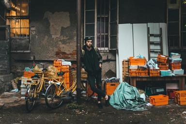 Keywords: alley concrete crates boxes papers magazines bikes bicycles young guy hat toque beanie backpack jacket jeans denim clothes fashion model urban people