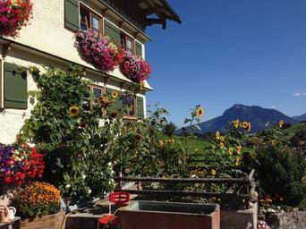 Keywords: allgäu bavaria farmhouse blue sky mountains flower box farm view garden