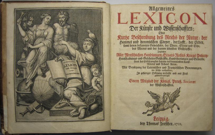 | Keywords: Allgemeines Lexicon der Künste und Wissenschaften (1721) - Titelblatt.jpg Johann Theodor Jablonski 1654-1731 Titelkupfer und Titelblatt von Allgemeines LEXICON Der Künste und Wissenschafften; Oder Kurtze Beschreibung des Reichs der Natur der Himmel und himmlischen Cörper der Lufft der Erden samt denen bekannten Gewächsen der Thiere Steine und Ertze des Meeres und der darinn lebenden Geschöpffe Ingleichen Aller Menschlichen Handlungen Staats- Rechts- Kriegs- Policey- Haußhaltungs- und Gelehrten Geschäffte Handthierungen und Gewerbe samt der Erklärung der darin vorkommenden Kunst-Wörter und Redens-Arten Mit Beysetzung der Lateinischen und Frantzösischen Benennungen wo solche vorhanden / In gehöriger Ordnung verfasset und mit Fleiß zusammen getragen von Einem Mitglied der Königl Preuß Societæt der Wissenschafften Johann Theodor Jablonski Series title Thomas Fritschen 1721 Leipzig Scan des Originals aus der Niedersächsischen Staats- und Universitätsbibliothek Göttingen Signatur <7> 8 DID 230/21 Other versions PD-old-100-1923 Allgemeines Lexicon der Künste und Wissenschafften 1721 Satyrs in engravings 18th-century engravings Pointing right in art People with birds in art Pouring in art 1721 books Illustrated title pages from Germany Frontispieces from Germany Humans with fictional creatures Open books Title pages from Germany |