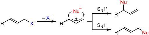 Keywords: Allylic SN1 rearrangement.svg C - en Allylic rearrangement - SN1' reaction self work with ChemDraw Su-no-G 2010-03-14 Reaction mechanisms SN1 reactions