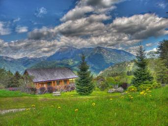 Keywords: alm hdr meadow home hut tree nature landscape roof sky green grass overshadowed clouds shelter gable dairy blue residence summer house forest