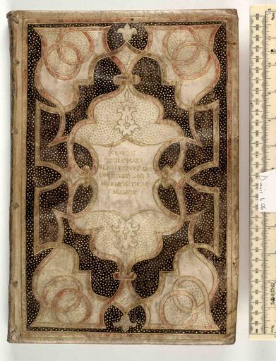 Keywords: Almagetum - Upper cover (Davis406).jpg Style Interlacing ribbon/strapwork Mottoes; Caption Upper cover; Colour White / cream; Edge Gilt and gauffered exhibition history Decorative Technique Painted; Cover Material Parchment Thin paste paper boards Pink headbands with a single bead See G D Hobson French and Italian Collectors p 33;Nixon Sixteenth century gold tooled bookbindings in the Pierpont Morgan Library; For other French 16c bindings see Marie-Pierre Laffitte Fabienne Le Bars Reliures royales de la Renaissance Paris 1999 object history Text 1528; Venice; Mahieu Thomas object type Cc-zero place of creation Binding France place of discovery Unspecified British Library image http //www bl uk/catalogues/bookbindings/LargeImage aspx RecordId 020-000004022 ImageId ImageId 41616 Copyright BL Almagetum Uploaded with GWToolset Almagetum - Upper cover Davis406 http //www webarchive org uk/bldatasets/bindings/6131_4 jpg Bookbinding 16th-century bookbinding British Library Bookbindings |