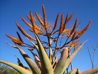 Keywords: aloe plant succulent flowers orange sear shaped flowers fierce blue sky nature