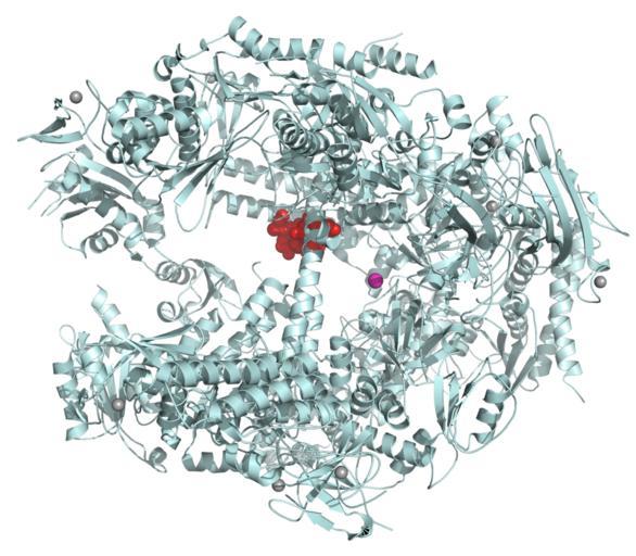 | Keywords: Alpha-Amanitin–RNA polymerase II complex 1K83.png  Ribbon diagram of Saccharomyces cerevisiae RNA polymerase II in complex with α-amanitin red Active site magnesium ion visible in pink near center <br>Created using PyMOL http //pymol sourceforge net and GIMP Style and orientation made to match http //www pnas org/content/vol99/issue3/images/large/pq0326646002 jpeg ; Legend lightblue w RNA polymerase II magenta w Active site magnesium ion red -amanitin grey w Zinc ions From PDB entry http //www rcsb org/pdb/cgi/explore cgi pdbId 1K83 1K83 <br>More information Kornberg RD Structural basis of transcription alpha-amanitin-RNA polymerase II cocrystal at 2 8 A resolution Proc Natl Acad Sci USA 99 3 1218 “22 2002 PMID 11805306 10 1073/pnas 251664698 http //www pnas org/cgi/content/full/99/3/1218 Free full text 2007-11-14 Fvasconcellos 21 15 14 November 2007 UTC Transferases Alpha-amanitin |