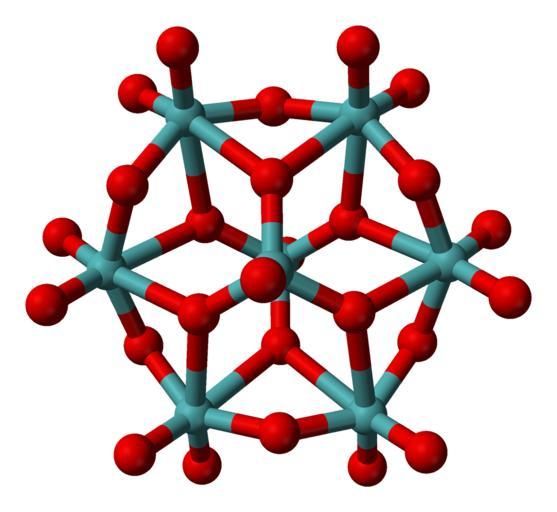 Keywords: Alpha-octamolybdate-from-xtal-3D-balls-A.png Ball-and-stick model of the α-octamolybdate anion Mo<sub>6</sub>O<sub>26</sub><sup>4 ˆ’</sup> as found in the crystal structure of bis2 2'- butane-1 4-diyl bis 1H-benzimidazolium α-octamolybdate VI C<sub>18</sub>H<sub>20</sub>N<sub>4</sub> <sub>2</sub>α-Mo<sub>8</sub>O<sub>26</sub> X-ray crystallographic data from http //dx doi org/10 1107/S1600536807003017 Acta Cryst 2007 E63 m584-m586 Model constructed in http //www crystalmaker com/ CrystalMaker 8 1 Image generated in http //accelrys com/products/discovery-studio/visualization/discovery-studio-visualizer html Accelrys DS Visualizer Own 2008-03-14 Ben Mills Benjah-bmm27 Images by Ben Mills Ball-and-stick models Alpha-octamolybdate ion |