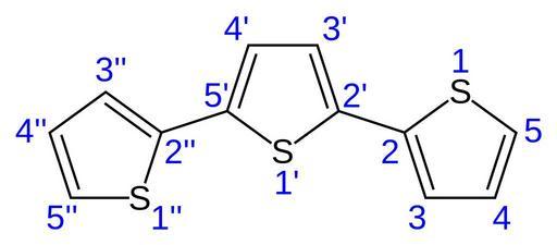Keywords: Alpha-Terthiophene numbering.svg Numbered structural diagram of 2 2' 5' 2<nowiki></nowiki>-Terthiophene Created using http //www acdlabs com/download/chemsk html ACD/ChemSketch 10 0 and Inkscape Own 2007-01-26 Fvasconcellos Thiophenes