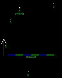 | Keywords: Alpha Ursae Minoris Comp.svg Erroneous depiction of component positions for the star system Alpha Ursae Minoris Component A is Polaris own 10 38 24 June 2010 UTC Antonsusi <span class signature-talk >talk</span> Data wikitable style text-align center; Component Rektascension Declination vis Magnitude mag Distance from A Polaris Direction - A 2<sup>h</sup> 31<sup>m</sup> 59 2<sup>s</sup> +89° 15' 51 2 1 - B 2<sup>h</sup> 31<sup>m</sup> 43 4<sup>s</sup> +89° 15' 39 9 1 18 4 218° - C 2<sup>h</sup> 35<sup>m</sup> 12 6<sup>s</sup> +89° 15' 57 13 1 44 7 83° - D 2<sup>h</sup> 32<sup>m</sup> 23 5<sup>s</sup> +89° 14' 29 12 1 82 7 172° Source http //vizier u-strasbg fr/viz-bin/VizieR-S CCDM 20J02319 2b8915 CCDM Catalog of Components of Double Multiple stars Dommanget+ 2002 Ursa Minor |