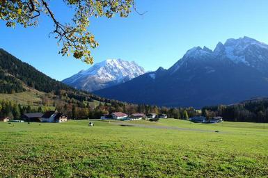 Keywords: alpine mountains autumn sunshine beauty relax nature valley alm sky mood hike distant blue view meadow panorama landscape sun sunny leisure peaceful bavaria watzmann berchtesgadener land hoher goll idyll recovery