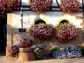 Keywords: alsace wine bottle flowers geraniums facade fleurie