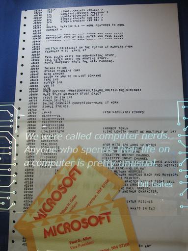 Keywords: Altair Basic Sign.jpg The title page of the Altair BASIC source listing It shows that Paul Allen Bill Gates and Monte Davidoff wrote this version between February 9 and April 27 1975 The listing was found by Professor Harry Lewis and is now in the Harvard University library The complete listing is around 100 pages long Early text editors required the source file to have line numbers It was common practice to initially increment the lines by 10 This made it easier to insert additional lines 00200 to 00320 - Printer format 00340 - Sub Title for header on each page 00360 to 00760 - Author names and dates list of things to do 00780 to 01081 - Constant definitions partially obscured More information about the listing can be found here http //www interact-sw co uk/altair/other 20versions/ian htm The uneven vertical character alignment in this listing suggests this was printed on a drum-type line printer This is part of a large 8 foot high wall display at the entrance to the STARTUP Albuquerque and the Personal Computer Revolution wing of the New Mexico Museum of Natural History and Science The museum allows photography by visitors with no restrictions I checked with the Public Relations Manager before my visit There is only a trivial amount of source code visible and by itself would not be creative enough for a copyright Photo by Michael Holley April 2007 Taken with a Canon PowerShot A630 1/25 second and F/2 8 using existing light Listing of Altair BASIC on display at the New Mexico Museum of Natural History and Science Swtpc6800 en User Swtpc6800 Michael Holley 2007-12-22 Swtpc6800 en User Swtpc6800 Michael Holley en Wikipedia Swtpc6800 <gallery> File New Mexico Museum Natural History and Science Startup jpg </gallery> previous interwiki source http //en wikipedia org/wiki/File Altair_Basic_Sign jpg en User Swtpc6800 Altair 8800 Micro Instrumentation and Telemetry Systems New Mexico Museum of Natural History and Science Photographs by User Swtpc6800 Bill Gates |