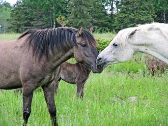 Keywords: Altamiro&Mistral.JPG en Sorraia stallion Altamiro with Arabian gelding Mistral Own Selona 2008 Sorraia Social behavior of horses Facial expressions of horses Stallions Geldings