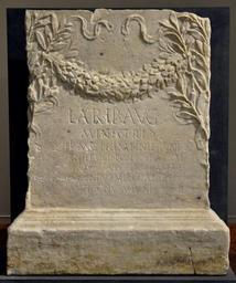 | Keywords: Altar für die Laren Liebieghaus 284.jpg de Altar für die Schutzgötter der Wege und Häuser Laren ; Rom 7 v Chr ; Marmor; Liebieghaus Frankfurt am Main Inv Nr 284 Siehe auch http //books google de/books id l5fVBfSKvKkC pg PA385 dq liebieghaus Altar for the spirits protecting roads and houses Larees ; Rome from the year 7 BC not 7th c BC as indicated on the sign in the museum ; Marble; Museum Liebieghaus Frankfurt am Main Inv Nr 284 es Ara votiva romana procedente de Roma correspondiente con CIL VI 447 Larib us Aug ustis / ministri / qui K alendis Aug ustis primi inierunt / Anteros D ecimi Poblici Barnai / Eros A uli Poblici Damae / Iucundus M arci Ploti Anterotis / Antigonus M arci Iuni Erotis own 2011-04 User FA2010 Antikensammlung des Liebieghauses 1st-century BC sculptures in the Liebieghaus 0s BC sculptures Inscriptions to the Lares Ancient Roman altars CIL VI 000447 |