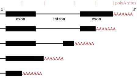 MAKE A MEME View Large Image Alternative polyadenylation.svg Illustration of how alternative polyadenylation can result in many variants of the 3'-most part of an mRNA Compared to the first mRNA the second one shows tandem polyadenylation sites the third a hidden exon ...