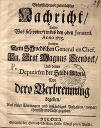 | Keywords: Altona.1713.1.jpg Gruendliche und zuverläßige Nachricht Dessen/was sich Anno 1713 begeben/ à ber den Schwedenbrand in Altona 1713 Ex Bibliotheca Gymnasii Altonani circa 1714 undatierter Nachdruck eines 1713 erschienen Drucks unknown; printed by Huelle Altona PD-Old Schwedenbrand Altona 1713 |