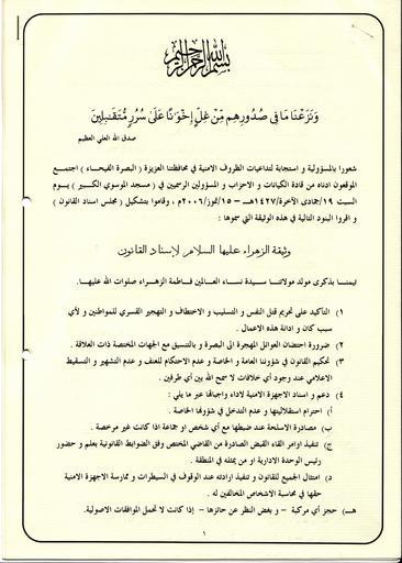 Keywords: Alzahraa1.jpg en Zahra document ar وثيقة الزهراء own Shuker 2011-02-13 للجميع وثيقة الزهراء التي وقعت في مسجد الموسوي الكبير في البصرة Cc-zero Arabic language