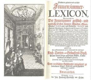 | Keywords: Amaranthes Frauenzimmer-Lexicon 1715.jpg Nutzbares galantes und curiöses <font color FF0080 >Frauenzimmer-</font> Lexicon </b> <font color FF0080 >Worinnen nicht nur</font> <font color FF0080 >Der Frauenzimmer geistlich- und</font> <font color FF0080 >weltliche Orden Aemter Würden Ehren-</font> Stellen Professionen und Gewerbe Privilegia und rechtliche Wohlthaten Hochzeiten und Trauer-Solennitäten Gerade und Erb-Stücken Nahmen und Thaten der Göttinen Heroinen gelehrter Weibes-Bilder Künstlerinnen Prophetinnen Affter- Prophetinnen Märtyrinnen Poetinnen Ketzerinnen Quackerinnen Schwärmerinnen und anderer Sectirischen und begeisterten Weibes-Personen Zauberinnen und Hexen auch anderer beruffener curiöser und merckens-würdiger Weibes-Bilder Trachten und Moden Küchen- Tafel- Wochenstuben- Wäsch- Nehe- Hauß- Speisekammer- Keller- Kinder-Putz Geräthe und Vorrath Juwelen und Schmuck Galanterie Seidne Wollne und andere Zeuge so zu ihrer Kleidung und Putz dienlich Rauch- und Peltzwerck Haar-Putz und Auffsatz Schmincken kostbare Olitäten und Seiffen Bücher-Vorrath Künste und Wissenschafften Nahmen Stamm- Nahmen und besondere Benennungen absonderliche Gewohnheiten und Gebräuche Eigenschaften sonderbare Redens-Arten und Termini Abergläubisches Wesen Tändeleyen und Sprüchwörter Häußliche Verrichtungen Divertissements Spiele und andere Ergötzlichkeiten allgemeine Zufälle Beschwerungen und Gebrechen der Weiber Jungfern und kleinen Kinder Gesinde-Ordnung und Arbeit weibliche Straffen absonderliche Züchtigungen und alles dasjenige was einem Frauenzimmer vorkommen kan und ihm nöthig zu wissen Sondern auch Ein vollkommenes und auf die allerneueste Art verfertigtes <font color FF0080 >Koch- Torten- und Gebackens-Buch </font> Samt denen darzu gehörigen Rissen Taffel- Auffsätzen und Küchens-Zettuln Ordentlich nach dem Alphabeth kurtz und deutlich abgefaßt und erkläret zu finden <font color FF0080 >Dem weiblichen Geschlechte insgesamt zu</font> sonderbaren Nutzen Nachricht und Ergötzlichkeit auff Begehren ausgestellet Von <font color FF0080 >Amaranthes </font> rule Leipzig 1715 bey Joh Friedrich Gleditsch und Sohn PD-old original upload log page de wikipedia Amaranthes_Frauenzimmer-Lexicon_1715 jpg 2005-11-26 15 51 Olaf Simons 970×849× 157542 bytes <nowiki>Nutzbares galantes und curiöses <font color FF0080 >Frauenzimmer-</font> Lexicon </b> <font color FF0080 >Worinnen nicht nur</font> <font color FF0080 >Der Frauenzimmer geistlich- und</font> <font color FF0080 >weltliche Orden Aemter Würd</nowiki> DEFAULTSORT Corvinus Gottlieb Siegmund Poets from Germany Jurists from Germany 1715 books Title pages from Germany Frontispieces from Germany |