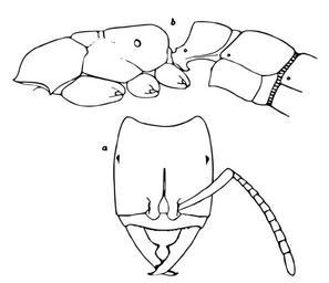 | Keywords: Amblyopone.michaelseni.-.wheeler.svg Amblyopone michaelseni worker from West Australia a head dorsal view; b thorax petiole and postpetiole in profile Wheeler 1927 Ants of the genus Amblyopone Erichson Proc Am Acad Arts Sci 62 1-29 http //research amnh org/entomology/social_insects/ants/publications/3386/3386 pdf PDF 1927 W M Wheeler pd-old PD-old Drawings of animals by William Morton Wheeler Drawings of ants | ||||
