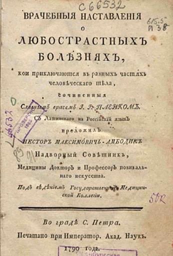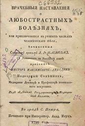 | Keywords: Ambodyk nastav.jpg en В ачебныя наставления о болезнях найболее изну яющих зд авие человека и за ажающих все телесныя части онаго / С латинскаго на оссийский язык п еложил и п имечаниями умножил есто Амбодик- аксимович едицины докто и п офессо http //elibrary orenlib ru/up/down/img/rare/vracheb_nastav jpg Ambodik-Maksimovich Nestor 1790 Ambodik-Maksimovich Nestor Paediatricians from Russia PD-old-100 | ||||