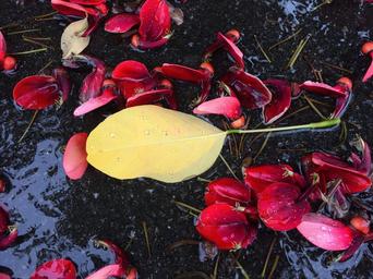 Keywords: america hashigo梧 america deigo flowers red drop of water puddle yellow leaf shopping centre parking lot fall flowers wind rain heisei-cho yokosuka japan