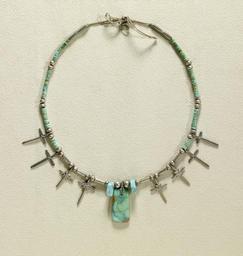 | Keywords: American - Necklace with Turquoise - Walters 57992.jpg This appealing silver and turquoise Pueblo necklace is of a style popular during the late 19th and early 20th centuries The necklace consists of turquoise and silver beads with silver cross pendants Christianity was introduced to the area by Franciscan priests from Spain; the necklace is reminiscent of the Spanish Catholic rosary early Other date century 20 turquoise silver cm 25 5 accession number 57 992 2260 Arizona Henry Walters Baltimore 1916 mode of acquisition unknown Walters Art Museum Henry Walters Acquired by Henry Walters 1916 Bedazzled 5 000 Years of Jewelry from the Walters Art Museum Frist Center for the Visual Arts Nashville; The John and Mable Ringling Museum of Art Sarasota; The Walters Art Museum Baltimore 2006-2009 Bedazzled 5 000 Years of Jewelry El Paso Museum of Art El Paso 2010 place of origin southwest USA Walters Art Museum license 20th-century art in the United States Jewellery in the Walters Art Museum Native American jewellery Cross chains Pueblo people Turquoise jewellery Crosses in jewellery |