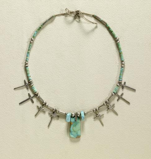 Keywords: American - Necklace with Turquoise - Walters 57992.jpg This appealing silver and turquoise Pueblo necklace is of a style popular during the late 19th and early 20th centuries The necklace consists of turquoise and silver beads with silver cross pendants Christianity was introduced to the area by Franciscan priests from Spain; the necklace is reminiscent of the Spanish Catholic rosary early Other date century 20 turquoise silver cm 25 5 accession number 57 992 2260 Arizona Henry Walters Baltimore 1916 mode of acquisition unknown Walters Art Museum Henry Walters Acquired by Henry Walters 1916 Bedazzled 5 000 Years of Jewelry from the Walters Art Museum Frist Center for the Visual Arts Nashville; The John and Mable Ringling Museum of Art Sarasota; The Walters Art Museum Baltimore 2006-2009 Bedazzled 5 000 Years of Jewelry El Paso Museum of Art El Paso 2010 place of origin southwest USA Walters Art Museum license 20th-century art in the United States Jewellery in the Walters Art Museum Native American jewellery Cross chains Pueblo people Turquoise jewellery Crosses in jewellery |