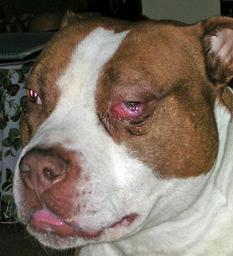 | Keywords: American Pit Bull Terrier (1).jpg A 2-yr-old pedigree American Pit Bull Terrier previously in excellent condition with masticatory muscle myositis There was a sudden onset of ophthamalic symptoms--third eyelid protrusion--before the onset of noticable trismus Within a 2-wk period the eyes were bulging and trismus progressed to the point that jaws could be opened less than 1 cm even under anaesthesia Inflammation of jaws was more pronounced on the left side Vision was permanently lost in the left eye Own 2005-02-25 PBarak Veterinary neurology Diseases and disorders of the eyes in dogs American Pit Bull Terrier heads |