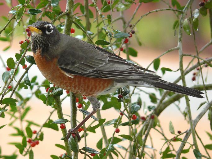 | Keywords: American Robin-27527.jpg An American Robin Turdus migratorius perched in the branches of a Weeping Holly tree Photo taken with a Panasonic Lumix DMC-FZ50 in Johnston County North Carolina United States http //www kenthomas us KenThomas us<br> personal website of photographer 2007-02-25 11 50-05 <sup>ISO 8601</sup> Ken Thomas This image is released to the public domain and therefore no permission or credit is required <br/> Comments and/or feedback however are always welcome See my user page for contact info Turdus migratorius Computer wallpaper Taken with Panasonic Lumix DMC-FZ50 |