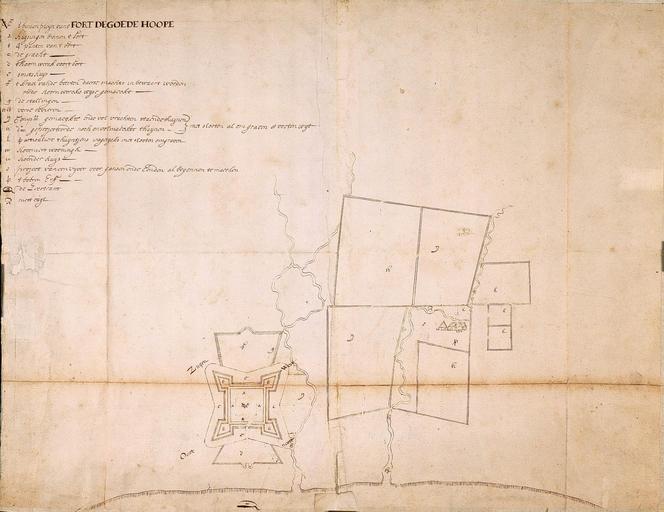 | Keywords: AMH-2543-NA Map of the Fort of Good Hope.jpg Artwork nl Plattegrond van fort de Goede Hoop nl Titel catalogus Leupe NA Plan van fort de Goede Hoop met het daarvoor gelegen Hoornwerk en bygelegen gebouwen tuinen enz Kaart van het fort de landerijen en gebouwen in omgeving van Kaap de Goede Hoop Notities verso 1654 van de Kaap II deel nrs 203; 498 d Potlood Gedrukt Catal Leupe 816 Legenda a-r en According to the Leupe catalogue NA the original title reads Plan van fort de Goede Hoop met het daarvoor gelegen Hoornwerk en bygelegen gebouwen tuinen enz Map of the fort the surrounding estates and buildings of the Cape of Good Hope Notes on reverse 1654 van de Kaap II deel nrs 203; 498 d Potlood Gedrukt Catal Leupe 816 Key a-r Atlas of Mutual Heritage na http //www atlasofmutualheritage nl/en/object/ id 2543 Source at the Atlas of Mutual Heritage - http //www gahetna nl/collectie/archief/inventaris/index/eadid/4 VEL/inventarisnr/816/level/file Source at the Nationaal Archief en Subjects chart / map / plan fortification building estate / plantation garden / ornamental garden key nl Onderwerpen plattegrond / kaart vesting gebouw landerij / plantage tuin / siertuin legenda en Fort this image is related to a VOC fort called http //www atlasofmutualheritage nl/en/fort/ id 15 kasteel de Goede Hoop Inscription 't binnen pleijn vant Fort de Goede Hoope nl circa 1654 nl Anoniem / Anonymous en Anoniem / Anonymous Institution Nationaal Archief nl pen op papier en pen on paper Size mm 420 530 accession number NL-HaNA_4 VEL_816 old number VEL0816 PD-Art-100 Maps of the Dutch East India Company - South Africa 1654 maps Castle of Good Hope |