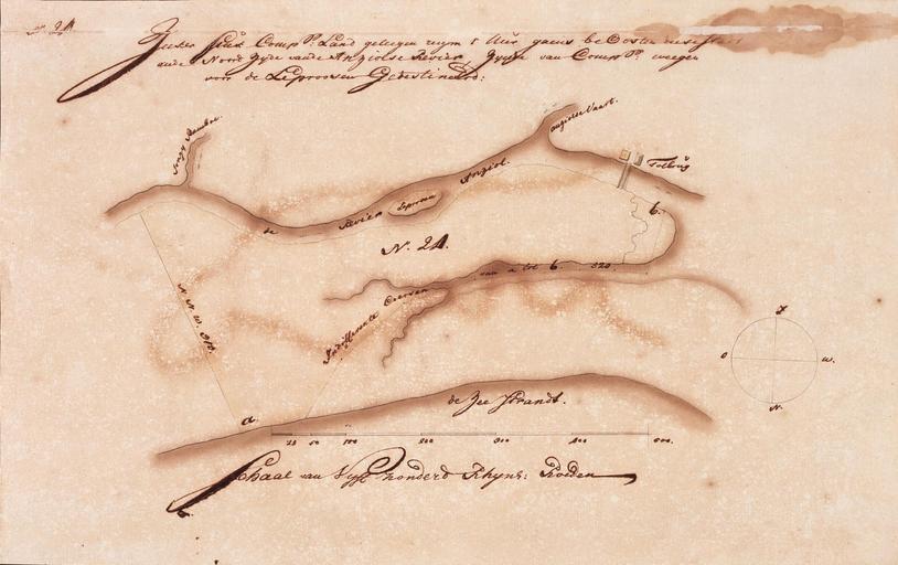 | Keywords: AMH-6056-NA Map of farmlands in the Batavia area, part twenty four.jpg Artwork nl Kaart van landerijen in de omgeving van Batavia deel vierentwintig nl Titel catalogus Leupe NA Zeeker stuk Compagnies's land geleegen ruijm 1 uur gaens beoosten deese stadt an de noordzijde van de Anziolse revier zijnde van Compagnie's weegen voor de leproosen gedestineerd Het kaartje maakt deel uit van een verzameling van 24 kaartjes en is genummerd no 24 linksboven en in het midden N 24 De nummers 11 20 21 en 26 ontbreken Op de afbeelding een plattegrond met de termen de Zee strand Leprosen de Revier Anziol Indifferente Coersen van a tot b Anziolse Vaart Tolbrug Rechts een kompas N O Z W en onder een schaalverdeling Schaal van Vijfhonderd Rhijns Roeden en Title in the Leupe catalogue NA Zeeker stuk Compagnies's land geleegen ruijm 1 uur gaens beoosten deese stadt an de noordzijde van de Anziolse revier zijnde van Compagnie's weegen voor de leproosen gedestineerd The map is part of a collection of 24 charts and is numbered no 24 top left and in the centre N 24 The numbers 11 20 21 and 26 are missing Depicted is a map featuring the terms de Zee strand Leprosen de Revier Anziol Indifferente Coersen van a tot b Anziolse Vaart Tolbrug To the right a compass N O Z W and below a scale Schaal van Vijfhonderd Rhijns Roeden Atlas of Mutual Heritage na http //www atlasofmutualheritage nl/en/object/ id 6056 Source at the Atlas of Mutual Heritage - http //www gahetna nl/collectie/archief/inventaris/index/eadid/4 VELH/inventarisnr/452 24/level/file Source at the Nationaal Archief en Subjects guard house / tollbooth compass / dial estate / plantation building chart / map / plan bridge nl Onderwerpen tolhuis / wachthuis kompas / windroos landerij / plantage gebouw plattegrond / kaart brug en Post this image is related to a VOC trading post called http //www atlasofmutualheritage nl/en/post/ id 328 Jakarta Inscription Zeeker Stuk Comp Land geleegen ruym 1 Uur gaens beOosten deese Stadt ande Noord Zyde vande Anziolse Revier zynde van Comp weegen voor de Leproosen Gedestineerd nl between 1689 1709 nl Anoniem / Anonymous en Anoniem / Anonymous Institution Nationaal Archief nl pen en penseel op papier en pen and brush on paper Size cm 26 5 42 5 accession number NL-HaNA_4 VELH_452 24 old number VELH0452_24 PD-Art-100 Maps of the Dutch East India Company - Indonesia |