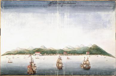 | Keywords: AMH-6130-NA View of Ambon.jpg Artwork nl Aanzicht op Ambon nl Titel catalogus Leupe NA Gezicht op de stad Amboina van de zeezijde De afbeelding toont een havenplaats met op de achtergrond enkele bergen Op de rede liggen grote Oostindiƫvaarders die de Nederlandse vlag voeren Bovenin onder het opschrift Afbeeldinge van Amboina een verklaring van de letters A-N en Title in the Leupe catalogue NA Gezicht op de stad Amboina van de zeezijde The picture depicts a port town with mountains in the background On the roadstead East Indiamen lie at anchor flying the Dutch flag Top below the inscription Afbeeldinge van Amboina is a key to the letters A-N Atlas of Mutual Heritage na http //www atlasofmutualheritage nl/en/object/ id 6130 Source at the Atlas of Mutual Heritage - http //www gahetna nl/collectie/archief/inventaris/index/eadid/4 VELH/inventarisnr/619 16/level/file Source at the Nationaal Archief en Subjects shipyard house anchorage / pier / harbour ship / vessel church / parsonage hospital / lazaret fortification building assembly hall / town hall survey / view flora nl Onderwerpen scheeps- / timmerwerf huis / woonhuis rede / haven / pier schip / vaartuig kerk / pastorie ziekenhuis / lazaret vesting gebouw raadhuis / stadhuis overzicht / aanzicht flora en Post this image is related to a VOC trading post called http //www atlasofmutualheritage nl/en/post/ id 316 Ambon Inscription Afbeeldinge van Amboina nl circa 1665 Creator Johannes Vingboons nl Johannes Vingboons landmeter / kaartenmaker en Johannes Vingboons land surveyor / mapmaker Institution Nationaal Archief nl aquarel/waterverf op papier en watercolour on paper Size cm 44 67 accession number NL-HaNA_4 VELH_619 16 old number VELH0619 16 PD-Art-100 Dutch East India Company 1665 Sailing ships of the Netherlands |