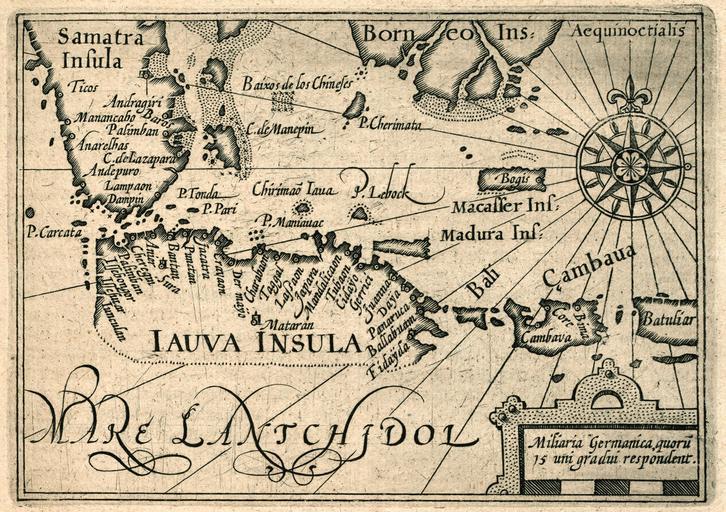 | Keywords: AMH-6466-KB Map of Sumatra, Java, Borneo, Macassar, Madura, Bali.jpg Artwork nl Kaart van Sumatra Java Borneo Macassar Madura Bali nl Kaart van Sumatra Java Borneo Macassar Madura Bali In cartouche Miliaria Germanica quoru 15 uni gradui respondent Deze afbeelding is afkomstig uit het werk van Willem Lodewijcksz die ook de tekening maakte waarop de kaart gebaseerd is Lodewijcksz werd hierbij geholpen door Pedro de Tayde een Portugees in Bantam die hiervoor met zijn leven betaalde en Map of Sumatra Java Borneo Macassar Madura Bali In cartouche Miliaria Germanica quoru 15 uni gradui respondent Atlas of Mutual Heritage kb http //www atlasofmutualheritage nl/en/object/ id 6466 Source at the Atlas of Mutual Heritage en Subjects compass / dial chart / map / plan banderole / cartouche / ornamentation nl Onderwerpen kompas / windroos plattegrond / kaart banderol / cartouche / versiering en Post this image is related to a VOC trading post called http //www atlasofmutualheritage nl/en/post/ id 317 Banten Inscription Iauva Insula / Samatra Insula / Borneo Insula / Miliaria Germanica quoru 15 uni gradui respondent nl 1614 Creator Willem Lodewijcksz nl Anoniem / Anonymous graveur / etser Willem Lodewijcksz gewerkt naar en Anoniem / Anonymous engraver / etcher Willem Lodewijcksz copied after Institution Koninklijke Bibliotheek nl gravure op papier en engraving on paper Size cm 13 9 accession number 496 D 12 deel II p 209 PD-Art-100 Maps of the Dutch East India Company - Indonesia 1614 |