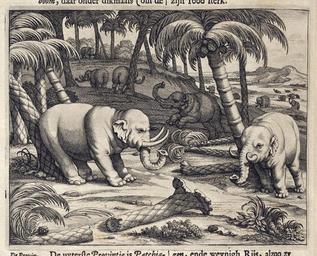 | Keywords: AMH-7002-KB Elephants pulling down palm trees.jpg Artwork nl Olifanten gooien palmbomen om nl Olifanten gooien palmbomen om Overal op Ceylon kwamen olifanten voor Op deze afbeelding is te zien hoe ze palmbomen omgooien om de vruchten en bladeren te eten en Elephants pulling down palm trees Elephants roamed the whole of Ceylon This print shows how they pulled down palm trees in order to eat the fruits and leaves Atlas of Mutual Heritage kb http //www atlasofmutualheritage nl/en/object/ id 7002 Source at the Atlas of Mutual Heritage en Subjects fauna flora survey / view nl Onderwerpen fauna flora overzicht / aanzicht circa 1672 Creator Johannes Janssonius Waasbergen nl Anoniem / Anonymous graveur / etser Johannes Janssonius Waasbergen uitgever en Anoniem / Anonymous engraver / etcher Johannes Janssonius Waasbergen publisher Institution Koninklijke Bibliotheek nl koperdruk op papier en copperplate printing on paper Size cm 13 17 accession number 189 A 6 deel II p 170 PD-Art-100 Dutch East India Company 1672 Elephants in art |