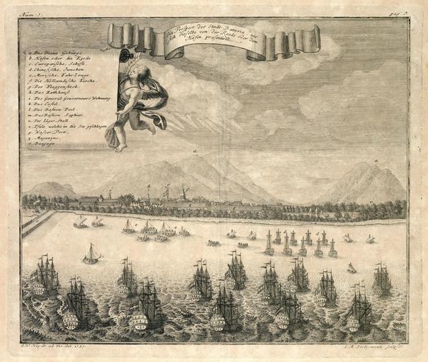 | Keywords: AMH-7015-KB View of Batavia.jpg Artwork nl Gezicht op Batavia nl Gezicht op Batavia in spiegelbeeld weergegeven Ein Prospect der Stadt Batavia wie sich dieselbe von der Reede oder dem Hafen praesentiret Legenda a Das Blaue Gebirge / b Hafen oder die Reede / c Europaeische-Schiffe / e Morische-Fahr Zeuge / f Die Hollaendische Kirche / g Der Flaggenstock / h Das Rathhauß / i Des General Gouverneurs Wohnung / k Das Castel / l Das Bastion Perl / m Das Bastion Saphier / n Der Läger-Stall / o Pfale welche in die See geschlagen / p Wasser-Port / q Magazyns / r Busgage Linksboven Num I en View of Batavia rendered as a mirror image Ein Prospect der Stadt Batavia wie sich dieselbe von der Reede oder dem Hafen praesentiret Key a Das Blaue Gebirge / b Hafen oder die Reede / c Europaeische-Schiffe / e Morische-Fahr Zeuge / f Die Hollaendische Kirche / g Der Flaggenstock / h Das Rathhauß / i Des General Gouverneurs Wohnung / k Das Castel / l Das Bastion Perl / m Das Bastion Saphier / n Der Läger-Stall / o Pfale welche in die See geschlagen / p Wasser-Port / q Magazyns / r Busgage Top left Num I Atlas of Mutual Heritage kb http //www atlasofmutualheritage nl/en/object/ id 7015 Source at the Atlas of Mutual Heritage en Subjects survey / view banderole / cartouche / ornamentation key ship / vessel building anchorage / pier / harbour church / parsonage fortification government building / residence assembly hall / town hall gate nl Onderwerpen overzicht / aanzicht banderol / cartouche / versiering legenda schip / vaartuig gebouw rede / haven / pier kerk / pastorie vesting gouvernementshuis / -gebouw raadhuis / stadhuis poort en Post this image is related to a VOC trading post called http //www atlasofmutualheritage nl/en/post/ id 328 Jakarta Inscription Ein Prospect der Stadt Batavia wie sich dieselbe von der Reede oder dem Hafen praesentiret author I W Heydt ad Viv del 1737 / I M Seeligmann sculpsit nl 1737 Creator Johann Wolfgang Heydt Creator I M Seeligmann Creator Johann Carl Tetschner nl Johann Wolfgang Heydt tekenaar I M Seeligmann graveur / etser Johann Carl Tetschner uitgever en Johann Wolfgang Heydt draughtsman I M Seeligmann engraver / etcher Johann Carl Tetschner publisher Institution Koninklijke Bibliotheek nl koperdruk op papier en copperplate printing on paper Size cm 25 5 29 accession number 2102 A 7 p 1 PD-Art-100 Dutch East India Company 1737 |