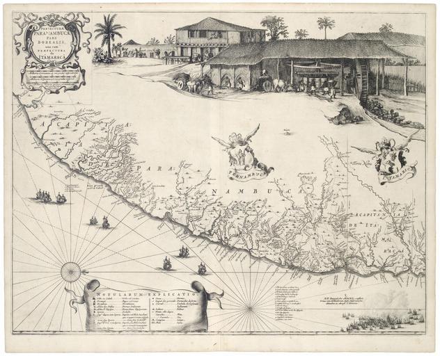 | Keywords: AMH-7288-KB Map of Pernambuco and Tamarica.jpg Artwork nl Kaart van Pernambuco en Tamarica nl Kaart van Pernambuco en Tamarica Pernambuca / I Tamarica De legenda in de banderole is verklaard door middel van symbolen Legenda rechtsonder a Ilha dos cedros ou d'ant o Vaaz / b Citade Maurtia v Maurits Stadt c F Frederick Henrick V Vyfhoeck / d F Ernestus daer by Vryburg ligt / e F Waerdenberg v dryhoeck / f Stede Reciff / g Watercasteel v Castello do mar / h Castello de S Iorge v Landtcasteel k Fort de Bruyn / l F Ioffrou de Bruyn / m F Prins Willem aen R dos Affogados / n Rio dos Afogados / o Teiibipio eene rivier / p Capiibari een rivier / q Iabebiri een rivier Legenda links 1 Guaibitingamiri / 2 Fonte de S Thomé / 3 R Tapado / 4 R de Graspar Gonçalo I XII Ianuarij an MDCXL conflixit Primo cum Hollandorum claße Hispanica hac altitudine ex adverso I Tamarica De kaart is overgenomen in de 'Atlas Maior' van Joan Blaeu 1665 Op de kaart staan de wapens van Pernambuco en Itamaracá Bijna het gehele bovenste gedeelte van de kaart wordt ingenomen door een tekening van een suikerrafinaderij met op de achtergrond huizen van Europese kolonisten Onderaan rechts een afbeelding van de eerste dag van de zeeslag tussen de Nederlandse en Spaanse vloten op 12 januari 1640 De rest van de zeeslag en het laatste deel van de suikermolen staan op de volgende kaart Koninklijke Bibliotheek Den Haag inv nr 1043 B 14 na p 68 Deze kaart is te verbinden met Koninklijke Bibliotheek Den Haag inv nr 1043 B 14 na p 28; Idem inv nr 1043 B 14 na p 38 2 en Idem inv nr 1043 B 14 na p 68 Cf Koninklijke Bibliotheek Den Haag inv nr 1049B13_095 en Map of Pernambuco and Tamarica Pernambuca / I Tamarica The key in the scroll is explained by means of symbols Key bottom right a Ilha dos cedros ou d'ant o Vaaz / b Citade Maurtia v Maurits Stadt c F Frederick Henrick V Vyfhoeck / d F Ernestus daer by Vryburg ligt / e F Waerdenberg v dryhoeck / f Stede Reciff / g Watercasteel v Castello do mar / h Castello de S Iorge v Landtcasteel k Fort de Bruyn / l F Ioffrou de Bruyn / m F Prins Willem aen R dos Affogados / n Rio dos Afogados / o Teiibipio eene rivier / p Capiibari een rivier / q Iabebiri een rivier Legenda links 1 Guaibitingamiri / 2 Fonte de S Thomé / 3 R Tapado / 4 R de Graspar Gonçalo I XII Ianuarij an MDCXL conflixit Primo cum Hollandorum claße Hispanica hac altitudine ex adverso I Tamarica The map was reproduced in Joan Blaeu's 'Atlas Maior' 1665 The map features the coats of arms of Pernambuco and Itamaracá Almost the entire top part of the chart is occupied by a drawing of a sugar refinery with in the background houses of European colonists Bottom right a depiction of the first day of the sea battle between the Dutch and Spanish fleets on January 12 1640 The rest of the sea battle and the remaining part of the sugar mill are shown on the next chart Koninklijke Bibliotheek The Hague inv nr 1043 B 14 after p 68 This map can be linked with Koninklijke Bibliotheek The Hague inv nr 1043 B 14 after p 28; Idem inv nr 1043 B 14 after p 38 2 and Idem inv nr 1043 B 14 after p 68 Cf Koninklijke Bibliotheek The Hague inv nr 1049B13_095 Atlas of Mutual Heritage kb http //www atlasofmutualheritage nl/en/object/ id 7288 Source at the Atlas of Mutual Heritage en Subjects chart / map / plan survey / view banderole / cartouche / ornamentation battle / taking / war fight Person building European North and South Americans ship / vessel compass / dial fauna nl Onderwerpen plattegrond / kaart overzicht / aanzicht banderol / cartouche / versiering veldslag / oorlog strijd / inname Persoon gebouw Europeanen Noord- en Zuid-Amerikanen schip / vaartuig kompas / windroos fauna Inscription Pernambuca / I Tamarica nl 1647 Creator Georg Marcgraf Creator Joan Blaeu sr Creator Cornelis Goliath Creator Frans Post nl Georg Marcgraf landmeter / kaartenmaker Joan Blaeu sr uitgever Cornelis Goliath landmeter / kaartenmaker Frans Post gewerkt naar en Georg Marcgraf land surveyor / mapmaker Joan Blaeu sr publisher Cornelis Goliath land surveyor / mapmaker Frans Post copied after Institution Koninklijke Bibliotheek nl koperdruk op papier en copperplate printing on paper Size cm 46 56 accession number 1043 B 14 na p 38 2 PD-Art-100 Maps of the West-Indische Compagnie 1647 |