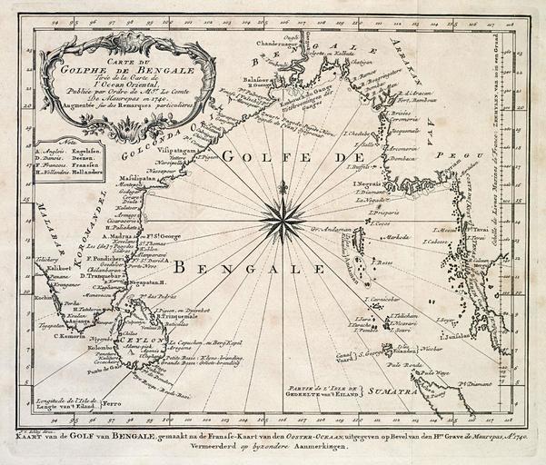 | Keywords: AMH-7927-KB Map of the Gulf of Bengal.jpg Artwork nl Kaart van de Golf van Bengalen nl Kaart van de Golf van Bengalen Kaart van de Golf van Bengale Carte du Golphe de Bengale Links staan de op de kaart gebruikte afkortingen verklaard en Map of the Gulf of Bengal Kaart van de Golf van Bengale Carte du Golphe de Bengale To the left on the chart the abbreviations used are explained Atlas of Mutual Heritage kb http //www atlasofmutualheritage nl/en/object/ id 7927 Source at the Atlas of Mutual Heritage en Subjects chart / map / plan key compass / dial banderole / cartouche / ornamentation nl Onderwerpen plattegrond / kaart legenda kompas / windroos banderol / cartouche / versiering Inscription Kaart van de Golf van Bengale author J v Schley direx nl 1747 Creator Pierre d' Hondt Creator Jacobus van der Schley Creator Maurepas nl Pierre d' Hondt uitgever Jacobus van der Schley direxit Maurepas gewerkt naar en Pierre d' Hondt publisher Jacobus van der Schley direxit Maurepas copied after Institution Koninklijke Bibliotheek nl gravure op papier en engraving on paper Size cm 17 20 accession number 693 C 6 dl II na p 300 PD-Art-100 Old maps of the Dutch East India Company Maps of the Dutch East India Company - Sri Lanka Maps of the Dutch East India Company - Burma Maps of the Dutch East India Company - Bangladesh Maps of the Dutch East India Company - India 1747 |