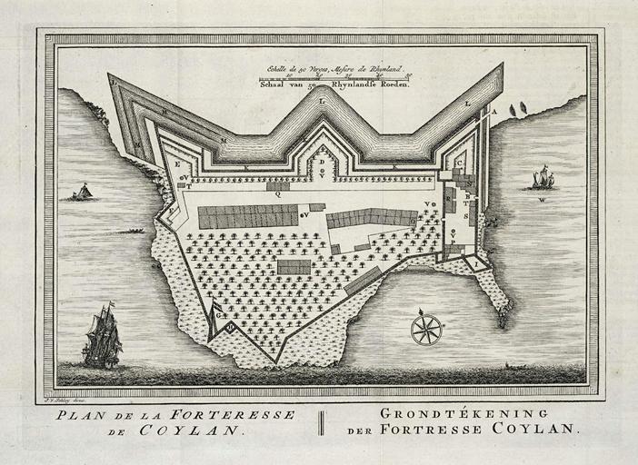 | Keywords: AMH-8022-KB Floor plan of the fort at Coylan.jpg Artwork nl Plattegrond van het fort te Coylan nl Plattegrond van het fort te Coylan Plan de la Forteresse de Coylan Grondtékening der Fortresse Coylan Op de plattegrond staan legendanummers Deze worden echter niet verklaard en Floor plan of the fort at Coylan Plan de la Forteresse de Coylan Grondtékening der Fortresse Coylan The floor plan is marked with numbers relating to a key But there are no explanatory notes to the key Atlas of Mutual Heritage kb http //www atlasofmutualheritage nl/en/object/ id 8022 Source at the Atlas of Mutual Heritage en Subjects chart / map / plan fortification ship / vessel compass / dial anchorage / pier / harbour nl Onderwerpen plattegrond / kaart vesting schip / vaartuig kompas / windroos rede / haven / pier en Post this image is related to a VOC trading post called http //www atlasofmutualheritage nl/en/post/ id 392 Quilon Inscription Plan de la Forteresse de Coylan / Grondtékening der Fortresse Coylan author J v Schley direx nl 1755 Creator Pierre d' Hondt Creator Jacobus van der Schley nl Pierre d' Hondt uitgever Jacobus van der Schley direxit en Pierre d' Hondt publisher Jacobus van der Schley direxit Institution Koninklijke Bibliotheek nl gravure op papier en engraving on paper Size cm 15 5 21 5 accession number 693 C 6 dl XIII op p 391 PD-Art-100 Maps of the Dutch East India Company - India 1755 |