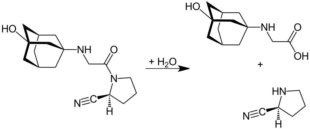 Keywords: Amide Hydrolysis V.1.svg en Amide_Hydrolysis de Amide_Hydrolyse own Jü 12/03/2011 Vildagliptin metabolism Cc-zero Metabolic pathways Chemical reactions