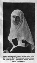 | Keywords: Amina Hanum Syrtlanoff 1916 2.jpg ru Амина-ханум Сы тланова вдова члена Госуда ственной Думы 3-го созыва попечительница санита ного т анспо та имени Российских мусульман 1916 Иллюст и ованное п иложение к газете овое в емя 1916 г PD-RusEmpire People of Russia in 1916 1916 photographs |
