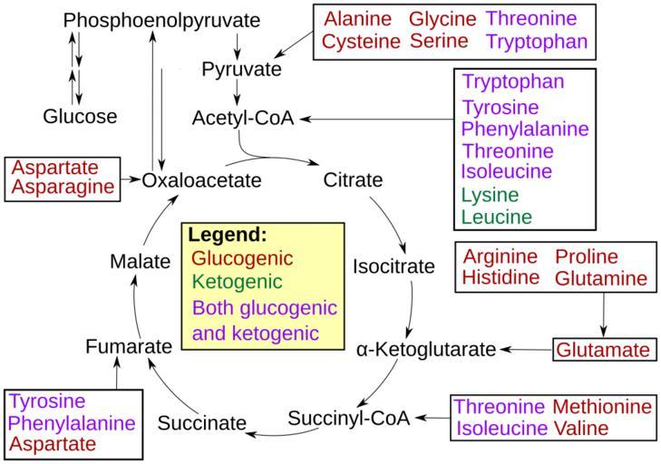 | Keywords: Amino acid catabolism revised.svg Amino acid catabolism This is a modified version of a diagram created July 2011 by Mikael Häggström and based on information in Lippincott's Illustrated Reviews Biochemistry<ref>Chapter 20 Amino Acid Degradation and Synthesis in cite book Denise R PhD Ferrier Lippincott's Illustrated Reviews Biochemistry Lippincott's Illustrated Reviews Lippincott Williams Wilkins Hagerstwon MD 0-7817-2265-9 </ref> The Lippincott's text and the original diagram contained several discrepancies when compared with 5 other prominent biochemistry textbooks This revised diagram represents consensus information from these 5 texts see References below Specific updates -There is a lack of agreement among textbooks about which amino acids enter at acetoacetate which enter at acetoacetyl CoA and which enter directly at acetyl CoA However the key point is that there are 7 amino acids that enter the TCA at acetyl CoA and the diagram has been revised to reflect this -Threonine was previously listed as glucogenic only but it is both glucogenic and ketogenic enters at acetyl CoA and has been updated accordingly -Tryptophan was listed as both glucogenic and ketogenic yet the old version of the diagram did not have it entering at any glucogenic substrate Diagram has been updated to show it enters at pyruvate -Only Phenylalanine and Tyrosine were listed as entering at Fumarate but Aspartate also does The diagram has been updated accordingly References reflist Garrett R H Grisham C M 2008 Biochemistry 5 ed Brooks Cole See p 805 Gropper S S Smith J L Groff J L 2009 Advanced Nutrition and Human Metabolism 5 ed Belmont CA Wadsworth Publishing Company Inc See p 212 Murray R K Bender D Rodwell V W Botham K M Kennelly P J Weil P A 2009 Harper's Illustrated Biochemistry 28 ed McGraw-Hill Medical See p 505 Nelson D L Cox M M 2009 Lehninger Principles of Biochemistry 5 ed W H Freeman and Company See p 688 Stipanuk M H 2006 Biochemical physiological molecular aspects of human nutrition 2 ed Saunders Elsevier See p 369 Made in Inkscape 2012-04-03 http //commons wikimedia org/wiki/File Amino_acid_catabolism svg Mikael Häggström Amino acid catabolism - versions cc-zero Amino acid metabolism |