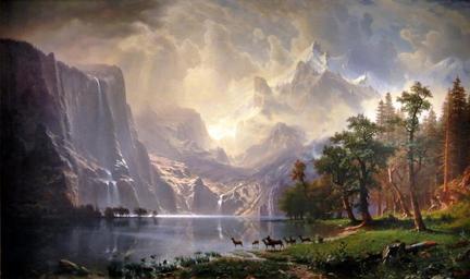 | Keywords: Among the Sierra Nevada Mountains (Bierstadt).jpg Among the Sierra Nevada Mountains California Oil on canvas cm 183 305 Washington D C Smithsonian American Art Museum 2nd Floor East Wing http //americanart si edu/collections/search/artwork/ id 2059 Smithsonian American Art Museum object history credit line Smithsonian American Art Museum Bequest of Helen Huntington Hull granddaughter of William Brown Dinsmore who acquired the painting in 1873 for The Locusts the family estate in Dutchess County New York accession number 1977 107 1 photo by James Steakley 1868 Creator Albert Bierstadt PD-old-100 Other versions 38 53 51 83 N 77 1 20 38 W scale 391_region US Among the Sierra Nevada Mountains by Albert Bierstadt |
